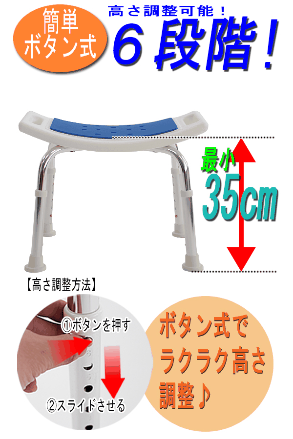 ●浴室で便利な幅広シャワーチェア ●使用者の体格に合わせて調整できるボタン式6段階高さ調整機能 ●座部に排水用の穴が12個あいており、水はけ抜群! ●座部に柔らかいポリエチレンプラスチック製のクッションが付いており、座り心地良好! ●錆びにくく、耐久性のあるアルミフレーム採用 ●運ぶ際に便利な持ち手付き ●脚先に滑り防止のゴムキャップ付き ●最大使用者体重:150kg ●素材:PEプラスチック(座部) XPEプラスチック(座部クッション) アルミ(フレーム) ラバー(脚先) ●重量:約1.5kg ●日本語組立て説明書付き ※組立ての際には、プラスドライバーが必要です。